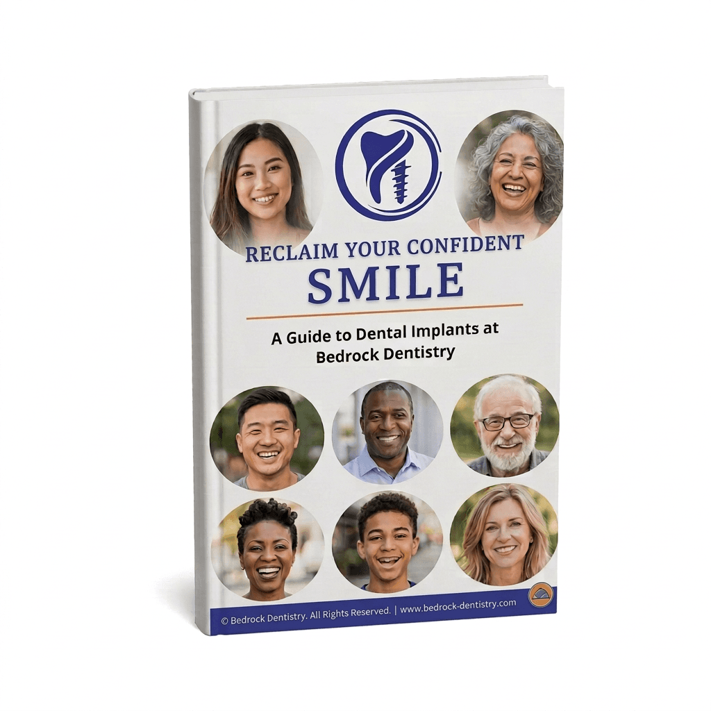 A dental implant is a titanium “root” placed into your jawbone that bonds with the bone over time (a process called osseointegration); on top of that, we attach a custom crown, bridge, or full‑arch restoration so it looks, feels, and functions like a natural tooth. At Bedrock Dentistry, we use CBCT 3D imaging to plan precise placement, so the implant supports your bite correctly and helps preserve the bone that would otherwise shrink after tooth loss.